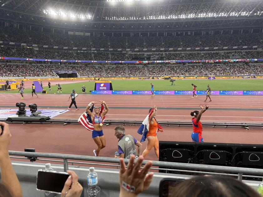 これは一昨日、世界陸上を観戦した際の写真です。メダルを獲得した選手たちが目の前を通ってくれました。