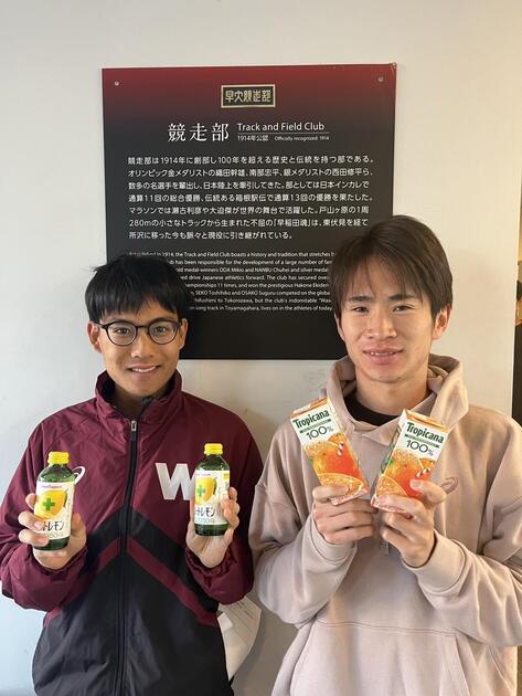 写真は左から長距離ブロック3年の工藤慎作、同じく4年で駅伝主将の山口智規です。