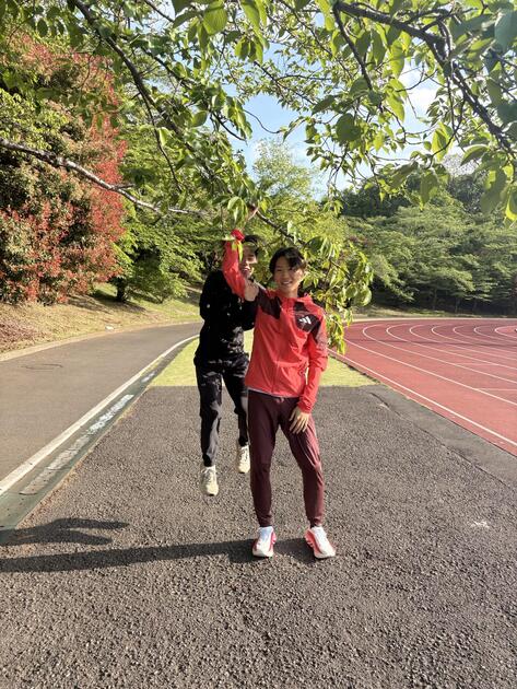 天紀(以下あまきち)とは一年の初めの授業が同じクラスで、そこからたびたび同じ授業を履修しています。ジョグを共にすることも多く、ペースが早いため出だしから先が思いやられると嘆かれています。そんなあまきちは怪我が多く走れない時期がとても多いです。(僕のジョグのせいという意見は一切受け付けておりません。)その度に三日で治すと言って三日後には走っています。なんだか不思議な治癒力の持ち主です。もう少し落ち着いて治せばいいのに笑 あまきちはトラックよりもロードの方が走れるタイプで、ロードでの練習で僕がPMをやった際は14分台が出るのに、記録会ではなかなか結果のでない厳しい一年間だったと思います。授業もジョグも一緒にやって赤点回避と行こうね!