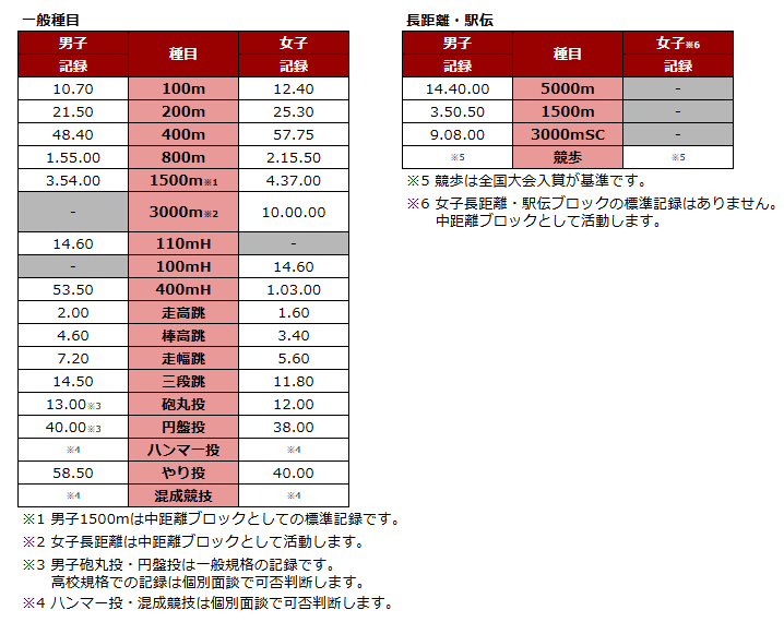 ①高校在学時に全国大会(U20、U18、インターハイ、国スポ)で入賞(リレー含む)経験のある者。(一般種目)